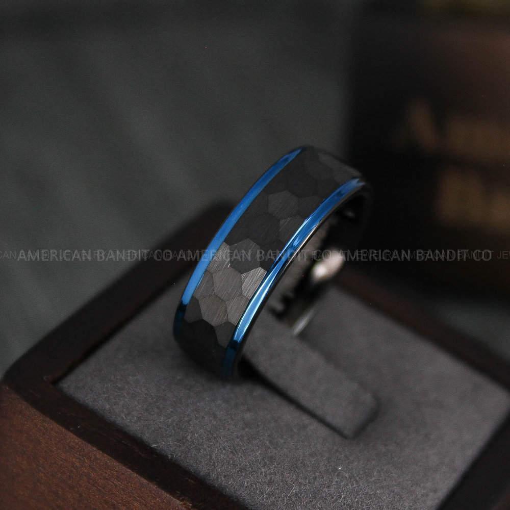 8MM BLACK TUNGSTEN BAND WITH BLUE STEP EDGE HAMMERED FINISH