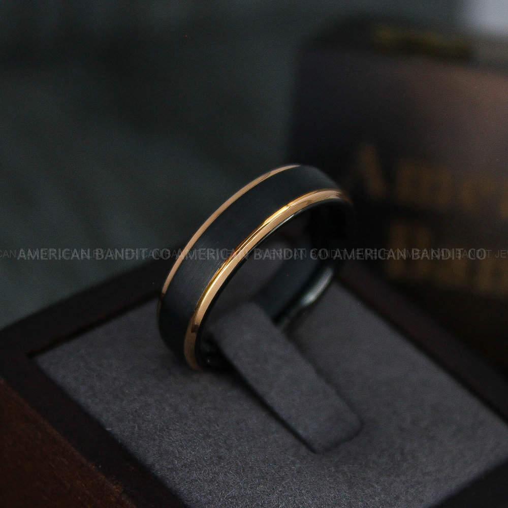 6MM BLACK TUNGSTEN BAND WITH 14K ROSE GOLD STEP EDGE