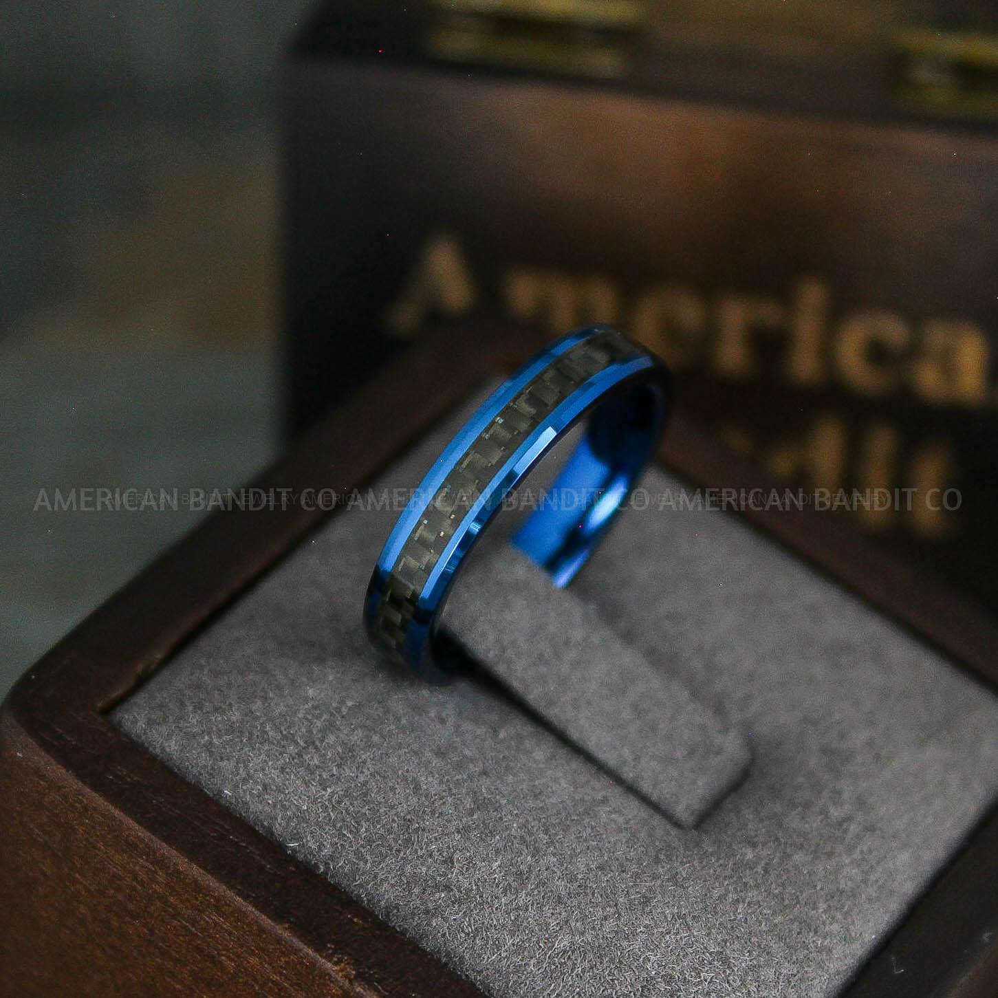 Blue Wedding Band, Blue Wedding Ring, Blue Tungsten Ring with Black Carbon Fiber Inlay, 4mm Blue Ring