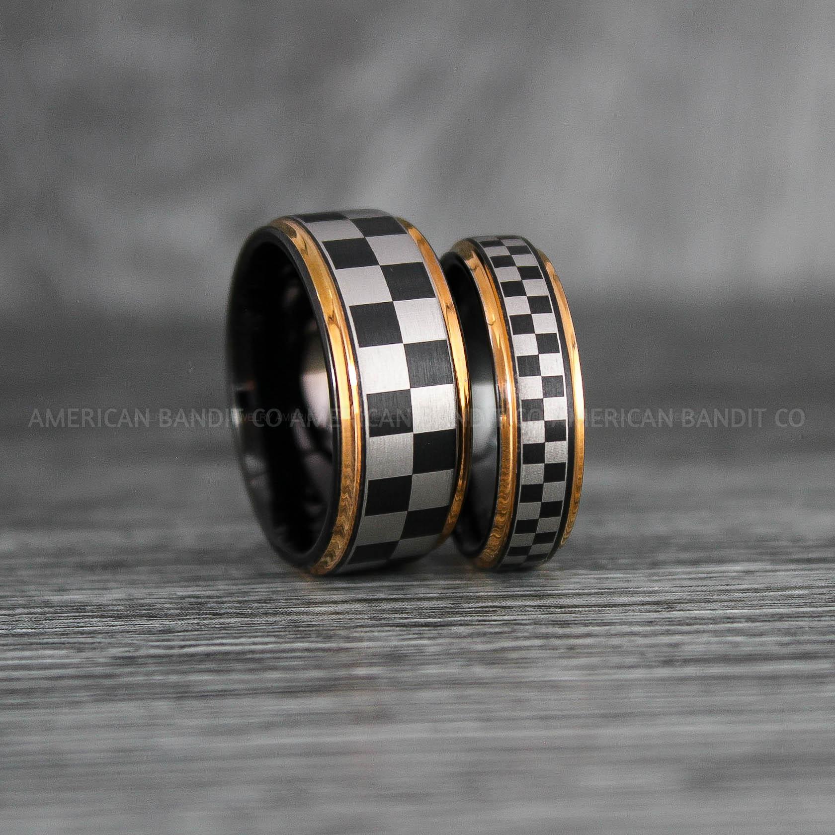 Checkered Flag Rings, Motor Sports Jewelry, Auto Racing Rings, Car Racing Rings, Checkered Flag Pattern Wedding Bands