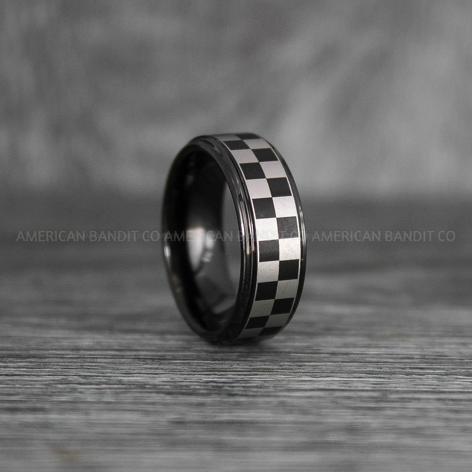 Checkered Flag Rings, Motor Sports Jewelry, Auto Racing Rings, Car Racing Rings, Checkered Flag Pattern Wedding Bands