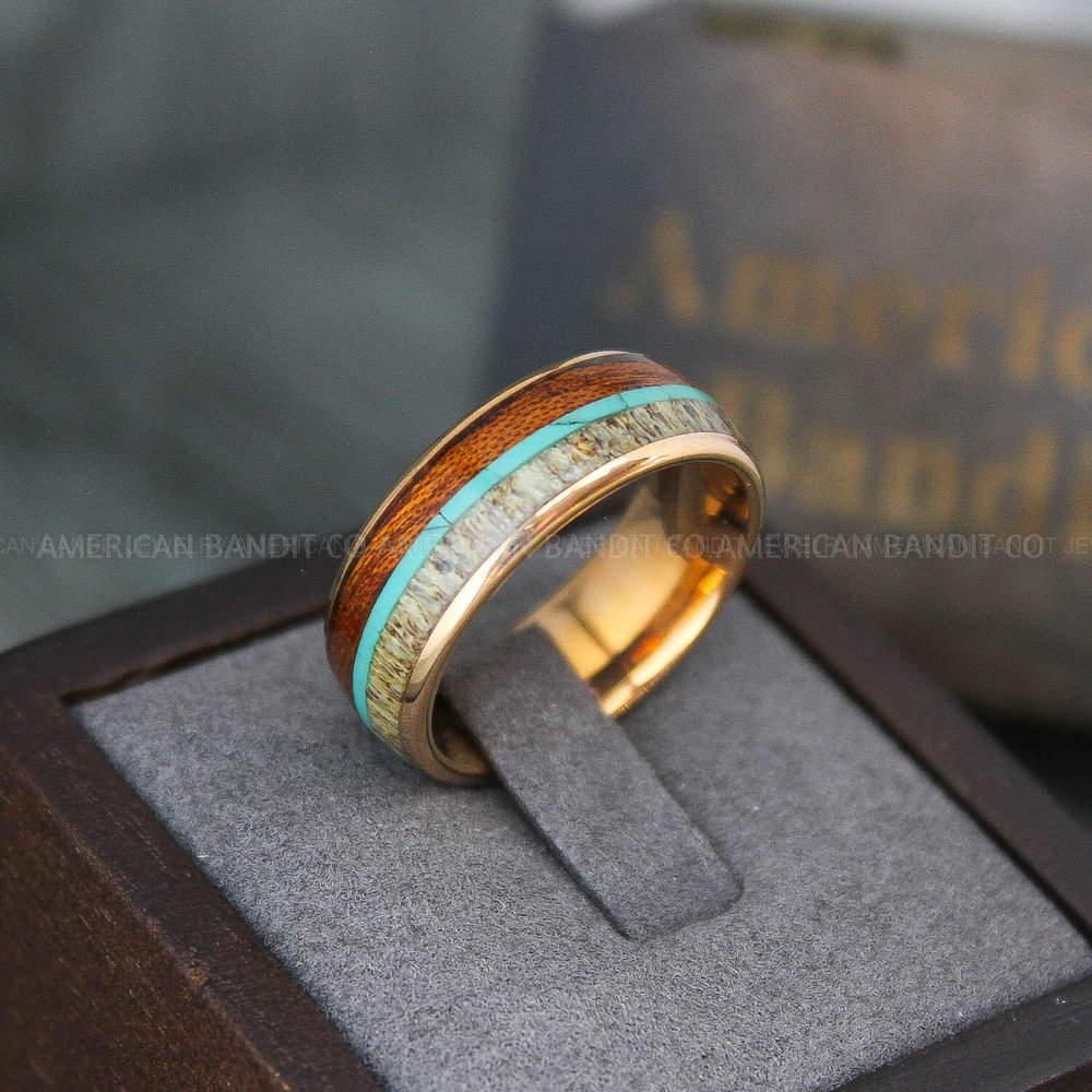 8MM ROSE GOLD TUNGSTEN BAND WITH TURQUOISE, DEER ANTLER, AND WOOD INLAY