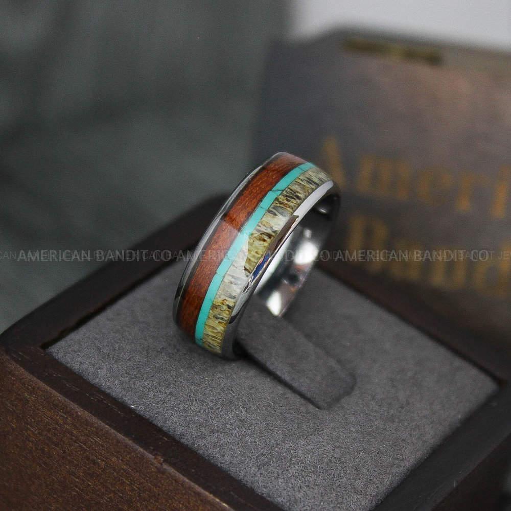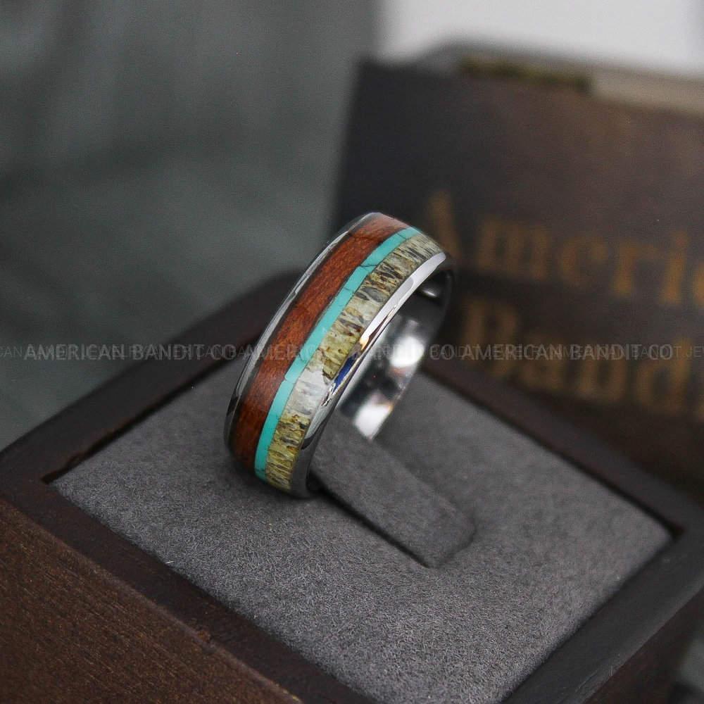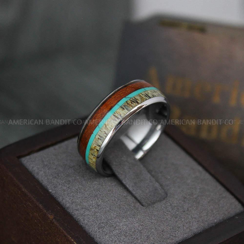 8MM SILVER TUNGSTEN BAND WITH TURQUOISE, DEER ANTLER, AND WOOD INLAY