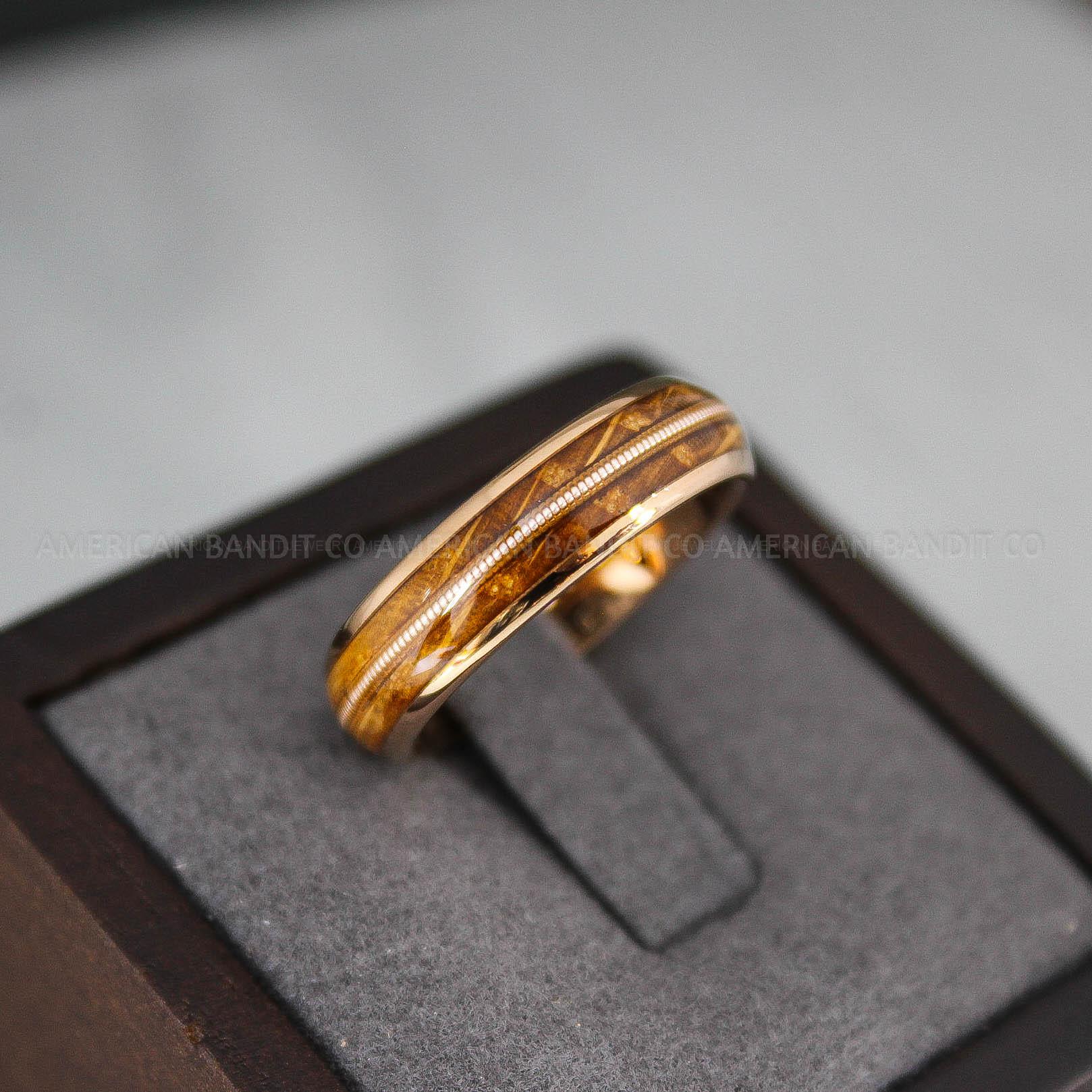 8MM 14K ROSE GOLD TUNGSTEN BAND WITH WHISKEY BARREL WOOD AND GUITAR STRING INLAY