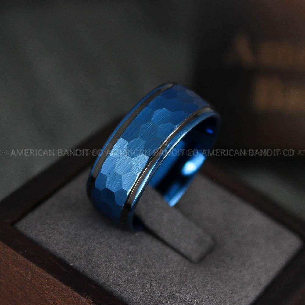 Blue Tungsten Hammered Wedding Ring, Blue Wedding Ring, Blue Wedding Band