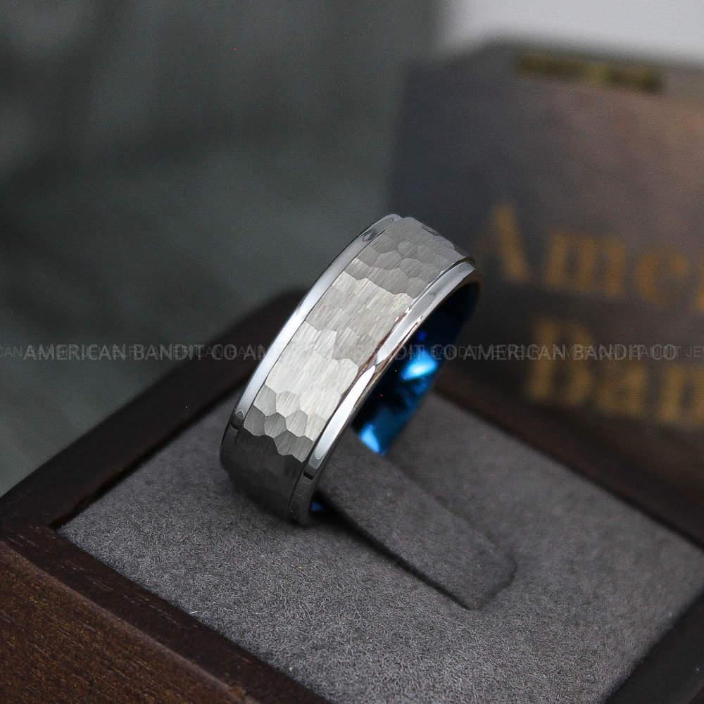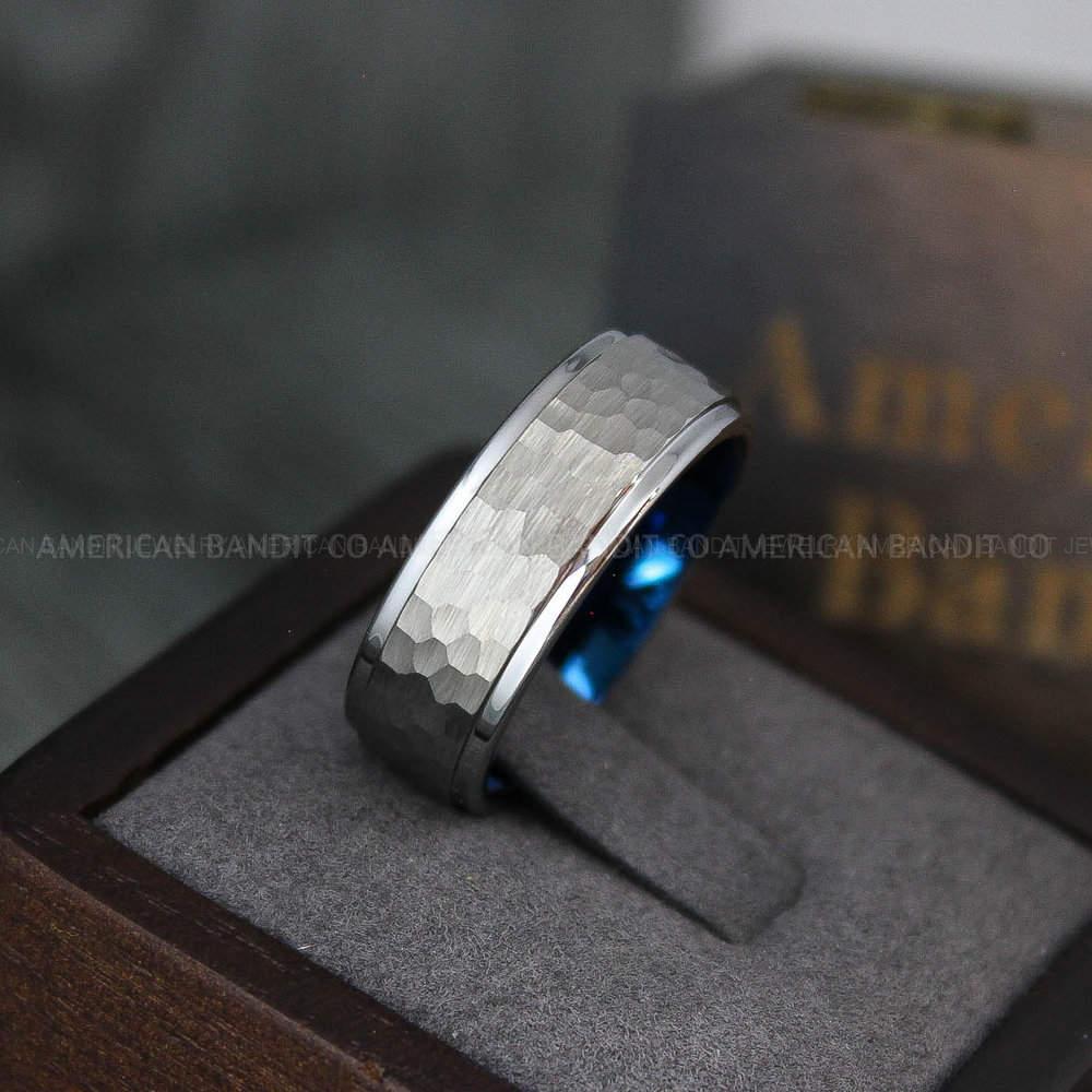 8MM SILVER TUNGSTEN BAND HAMMERED FINISH BLUE INTERIOR
