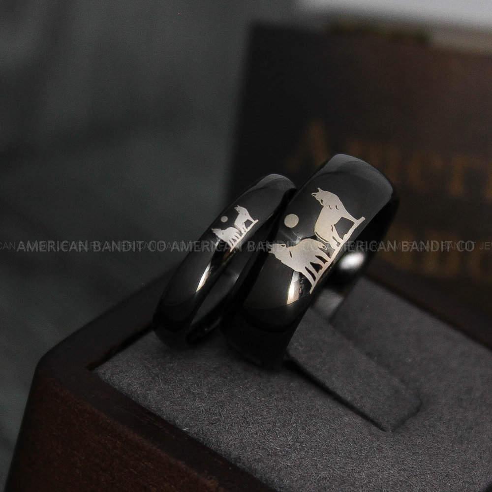 Howling Wolves Rings, Wolf Rings, Couple Rings, Black Rings, Black Tungsten Rings, Wolves Rings, Wolf Howl Rings, Black Wedding Bands