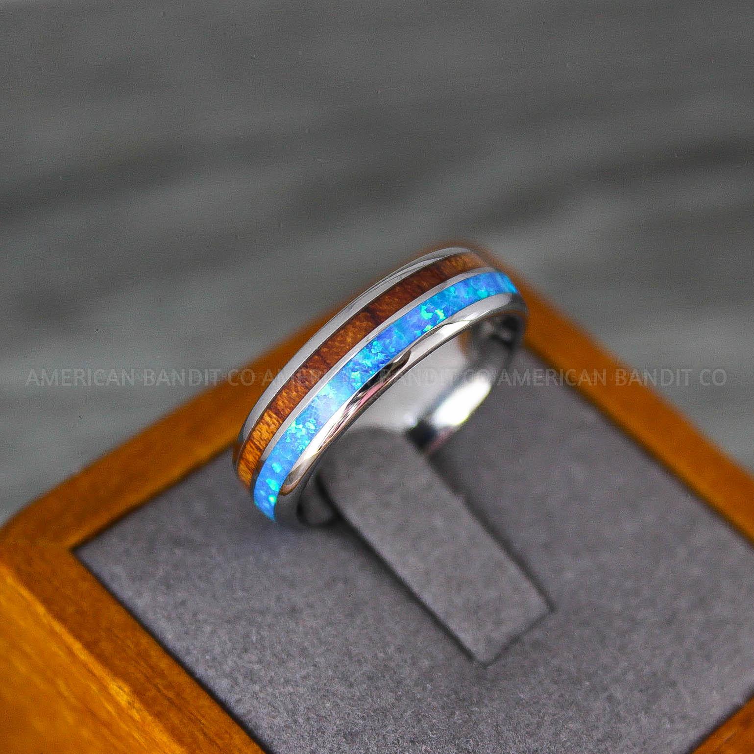 8MM SILVER TUNGSTEN BAND WITH OPAL AND WOOD INLAY