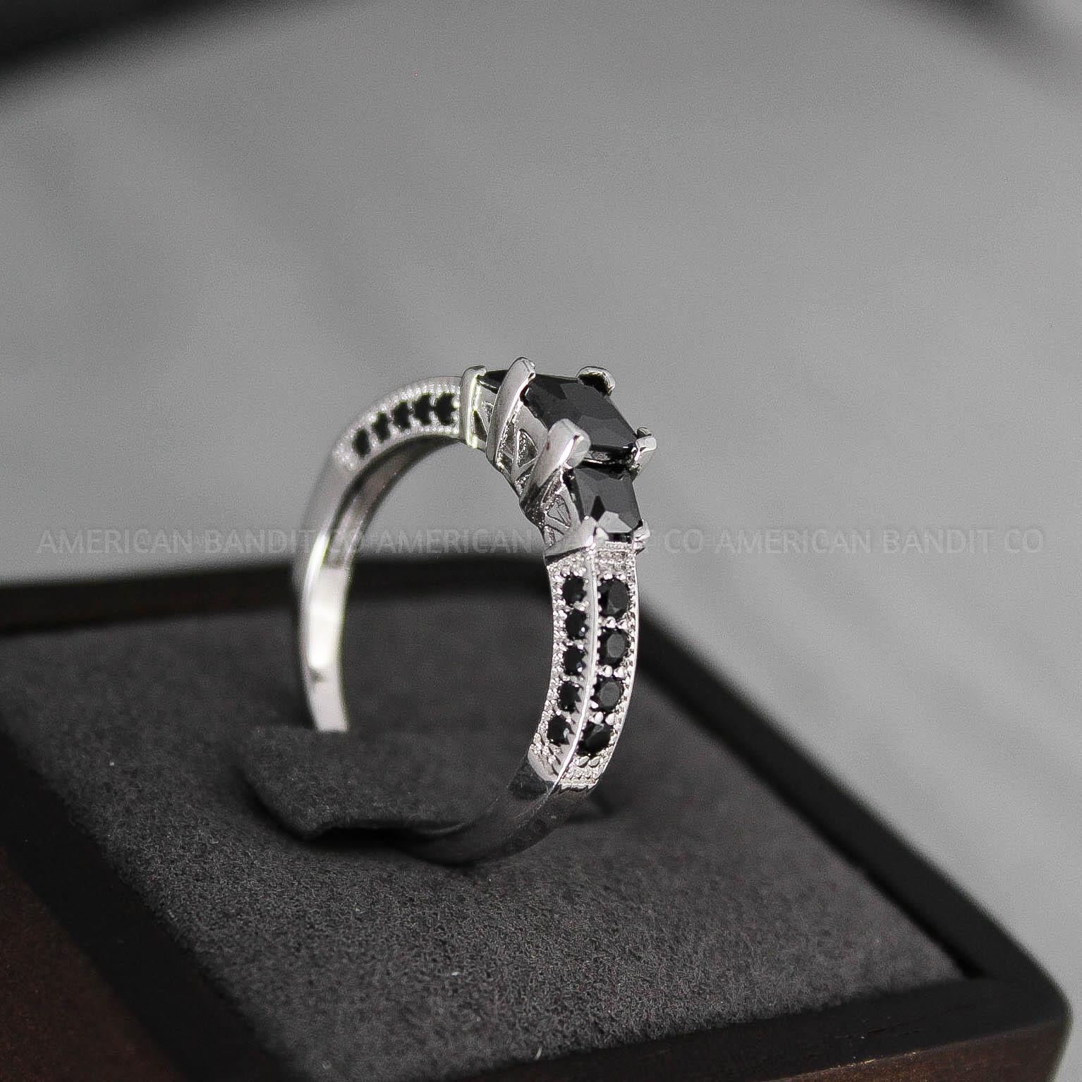 3MM .925 STERLING SILVER THREE STONE BAND PRONG SETTING (20 x OBSIDIAN BLACK DIAMOND CZ (1.5MM), 8 x OBSIDIAN BLACK DIAMOND CZ (2.5MM), 2 X OBSIDIAN BLACK DIAMOND CZ (3.5MM) & CENTER OBSIDIAN BLACK DIAMOND CZ (5.5MM))