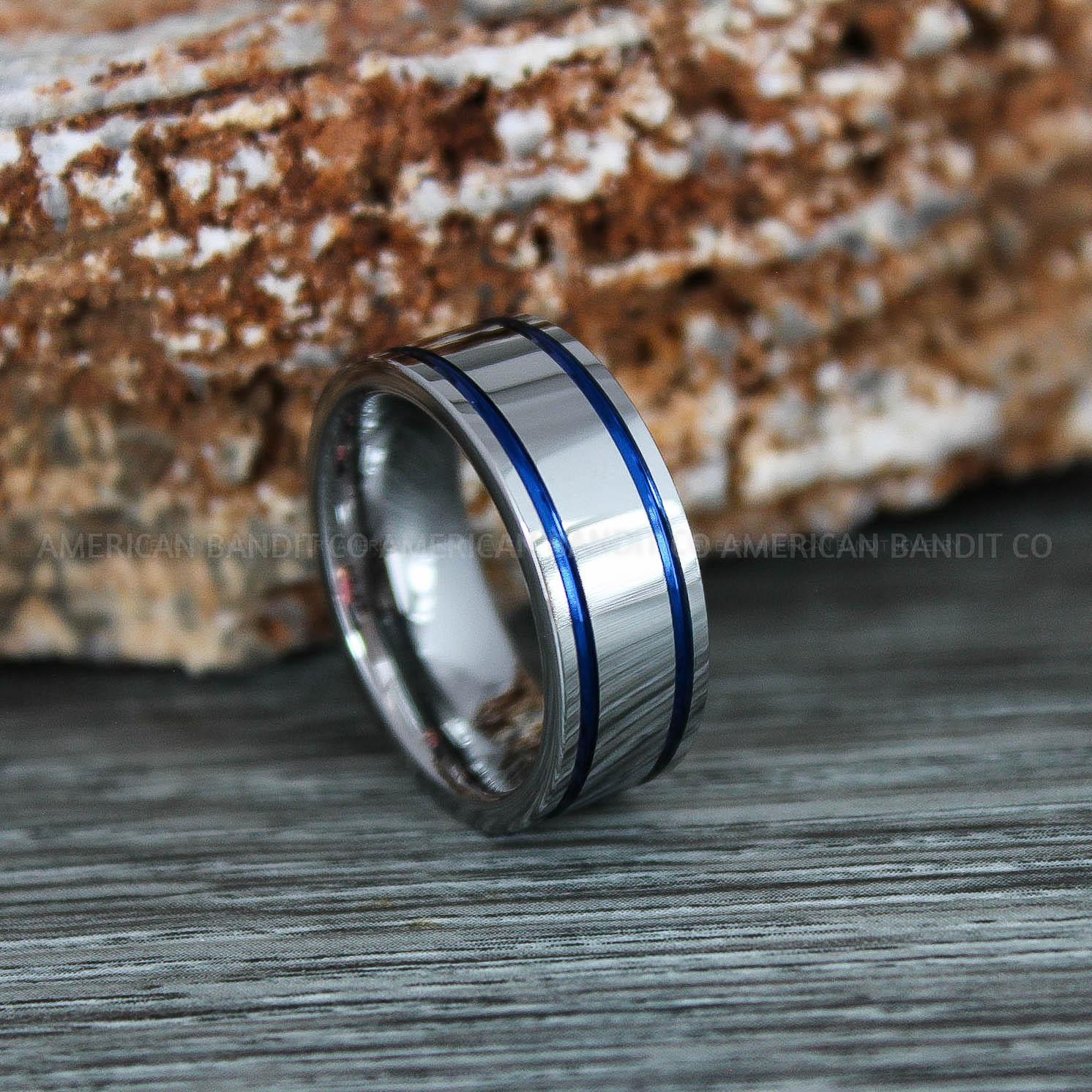 8MM SILVER TUNGSTEN BAND WITH FLAT EDGE AND TWO BLUE GROOVES