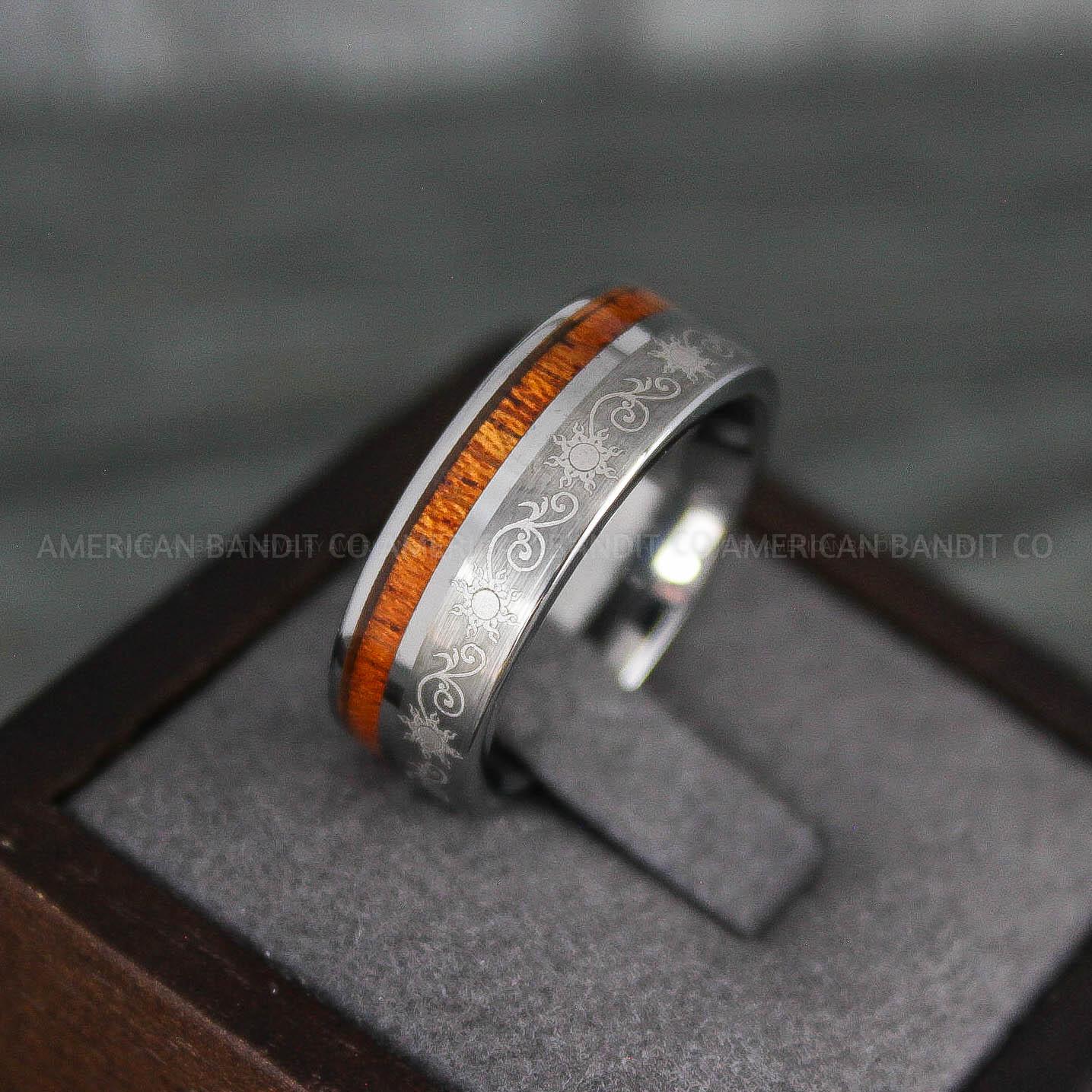 8MM SILVER TUNGSTEN BAND WITH WOOD INLAY = SUN
