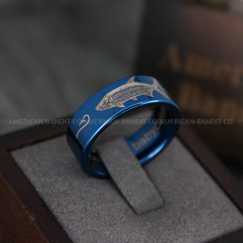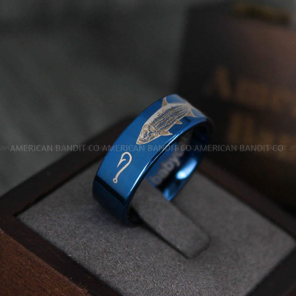 Tarpon Ring, Tarpon Jewelry, Fishing Ring, 8mm Blue Tungsten Band with Flat Edge Tarpon Fish Ring, Hunting Ring, Fish Hooks Ring