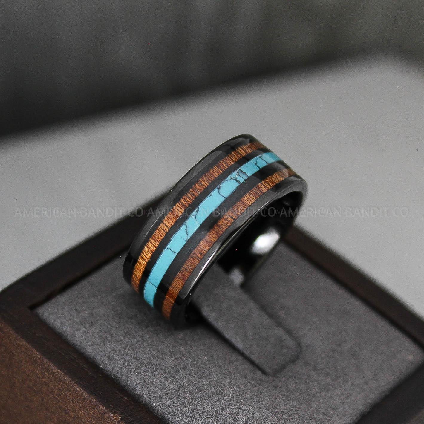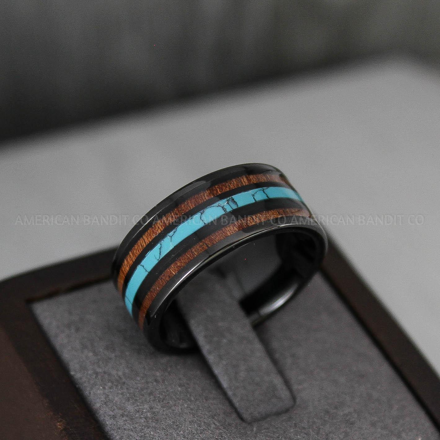 10MM BLACK TUNGSTEN BAND WITH TURQUOISE AND WOOD INLAY