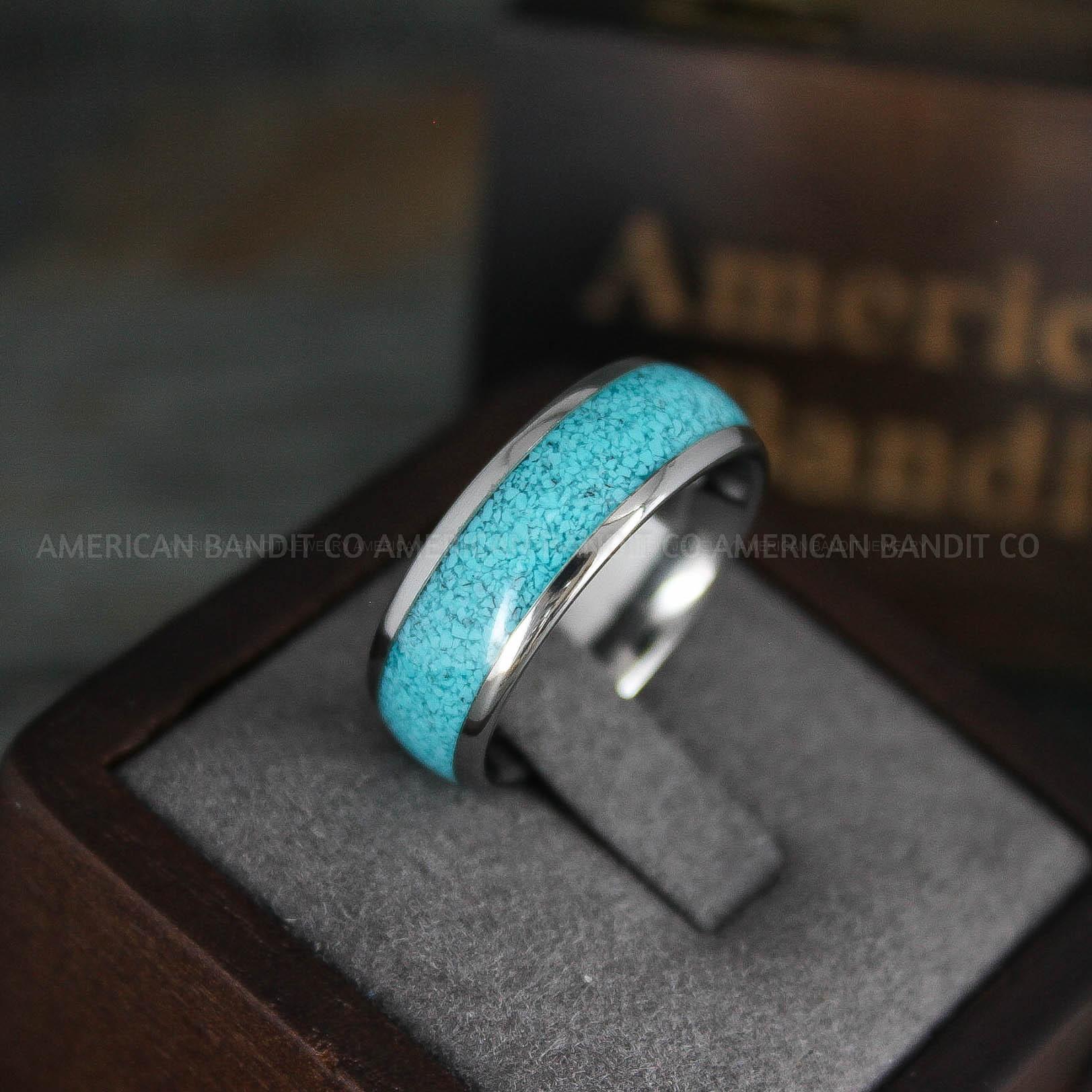 8MM SILVER TUNGSTEN BAND WITH CRUSHED TURQUOISE INLAY