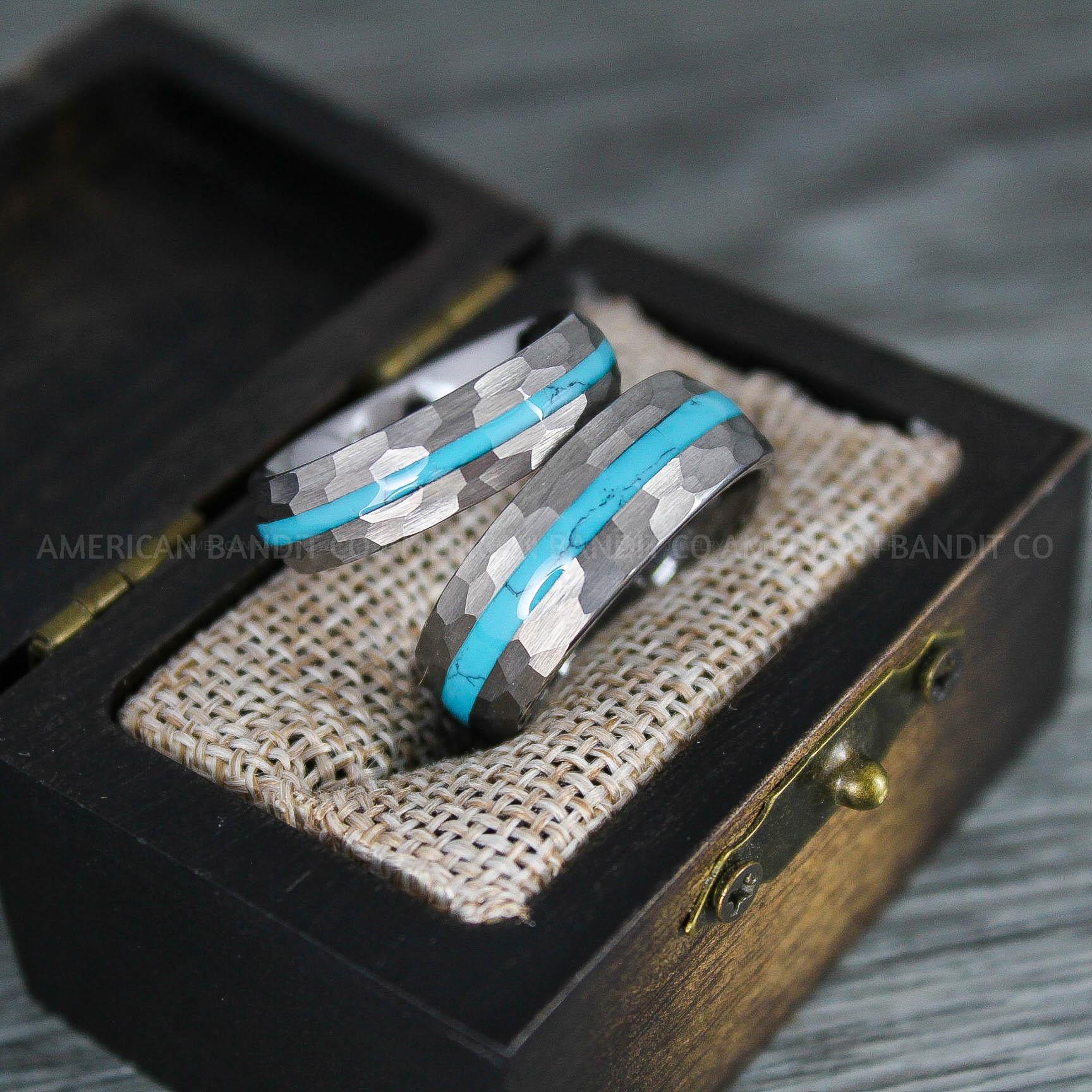 8MM SILVER TUNGSTEN BAND WITH TURQUOISE INLAY HAMMERED FINISH