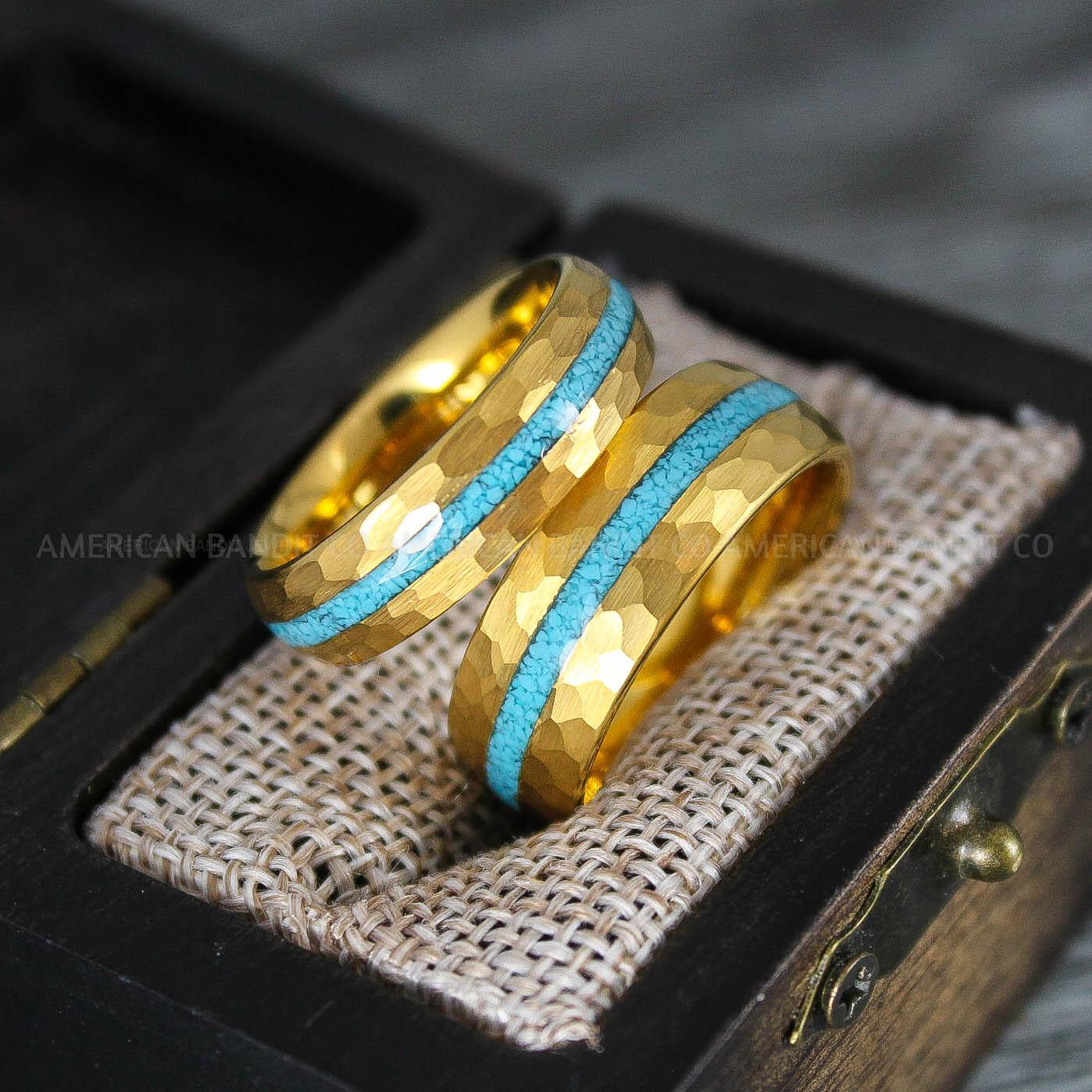 8MM YELLOW GOLD TUNGSTEN BAND WITH TURQUOISE INLAY HAMMERED FINISH