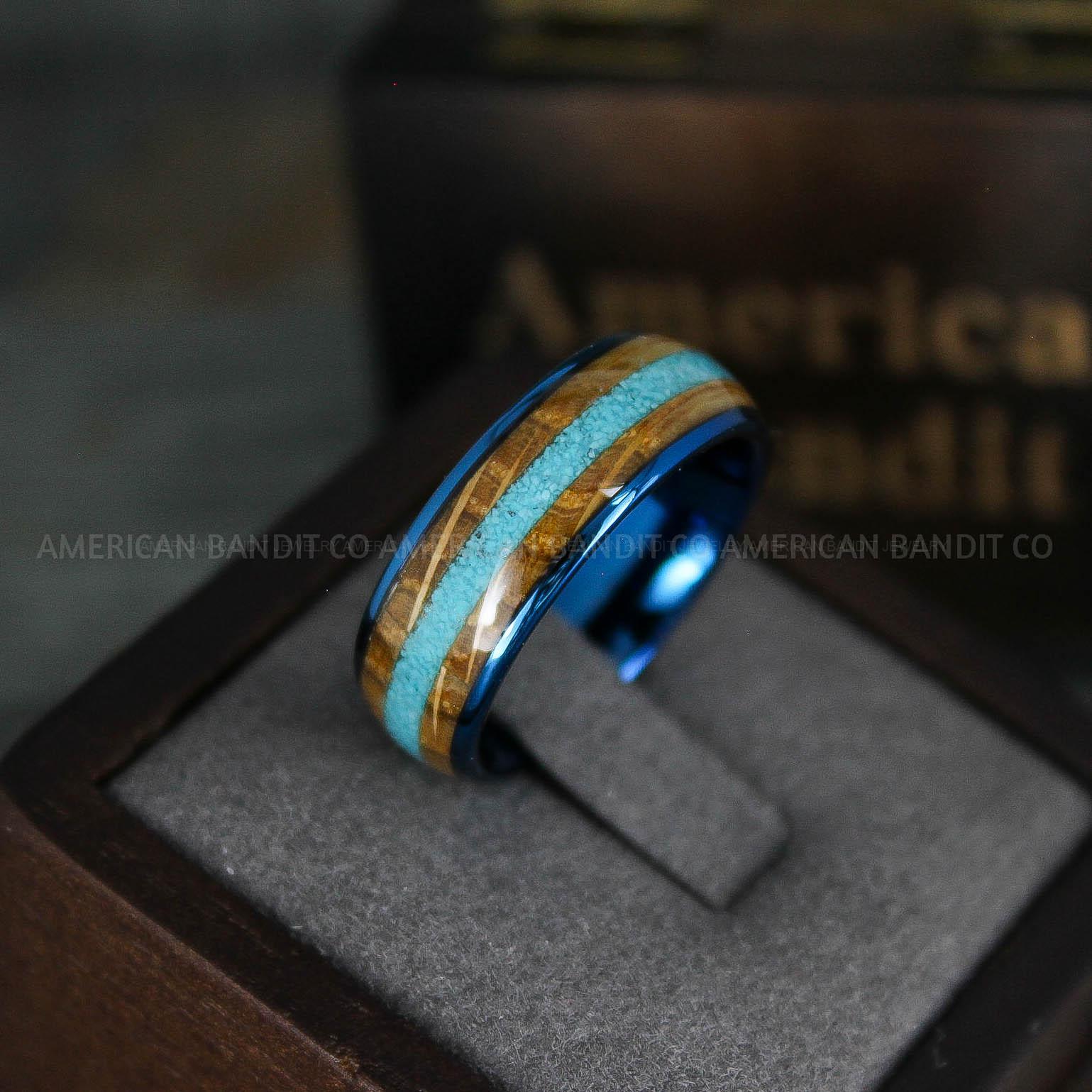 8MM BLUE TUNGSTEN BAND WITH TURQUOISE AND WHISKEY BARREL WOOD INLAY