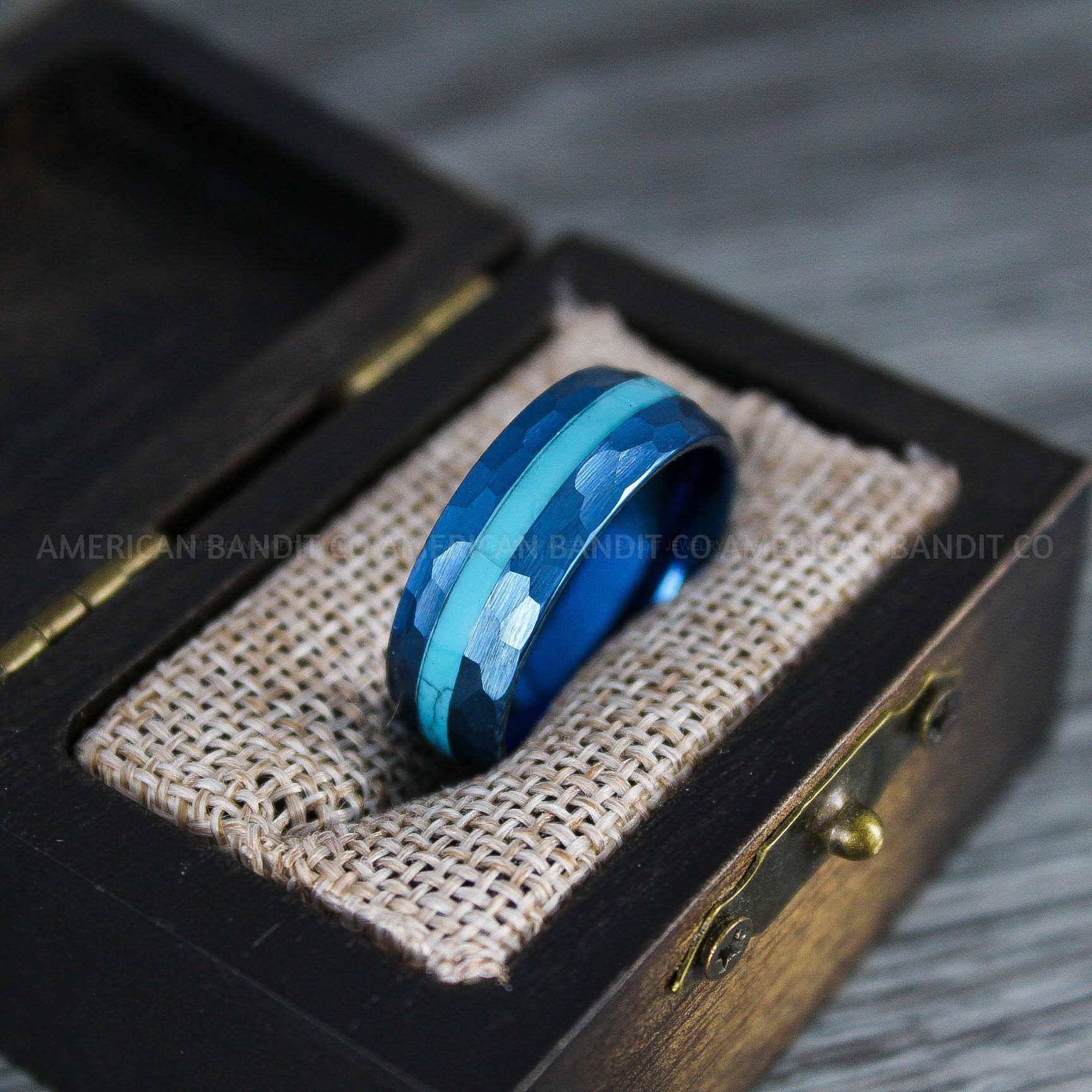 8MM BLUE TUNGSTEN BAND WITH TURQUOISE INLAY HAMMERED FINISH