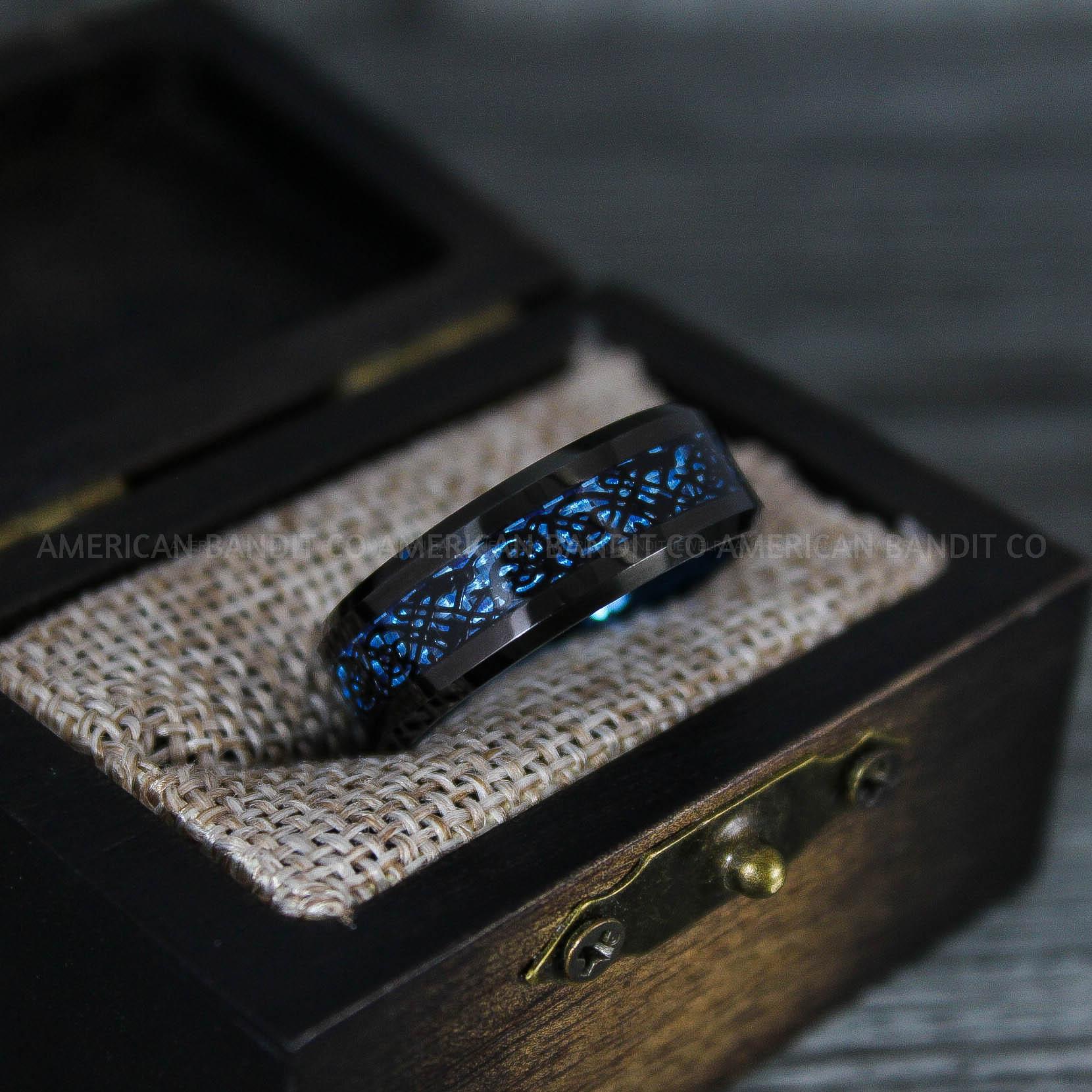 8MM BLACK TUNGSTEN BAND WITH BLUE CARBON FIBER AND BLACK DRAGON INLAY