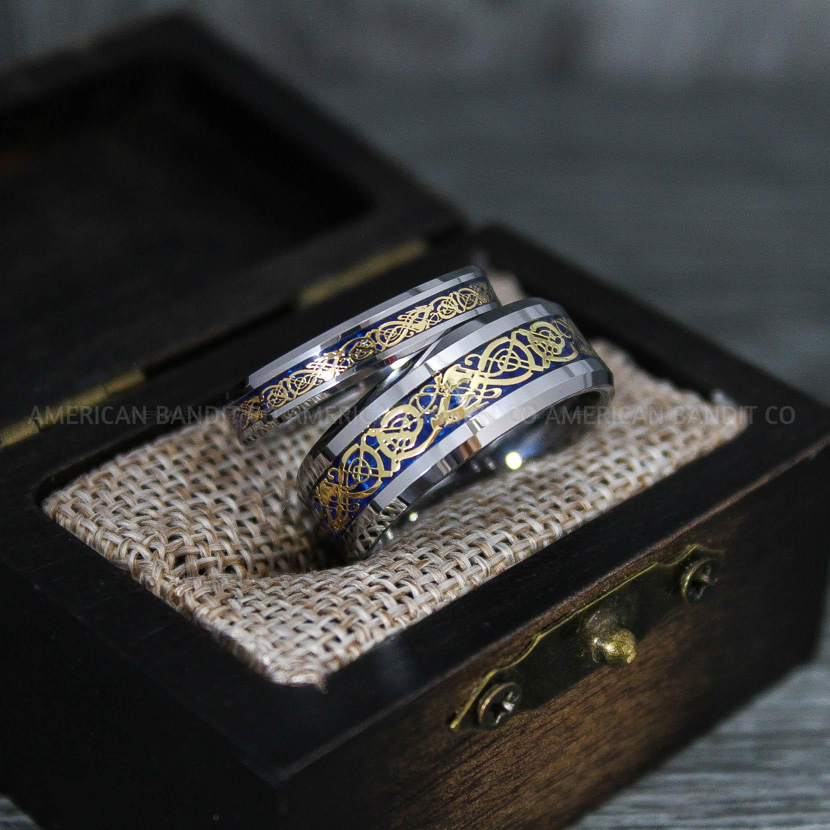 8MM SILVER TUNGSTEN BAND WITH BLUE CARBON FIBER AND GOLD DRAGON INLAY