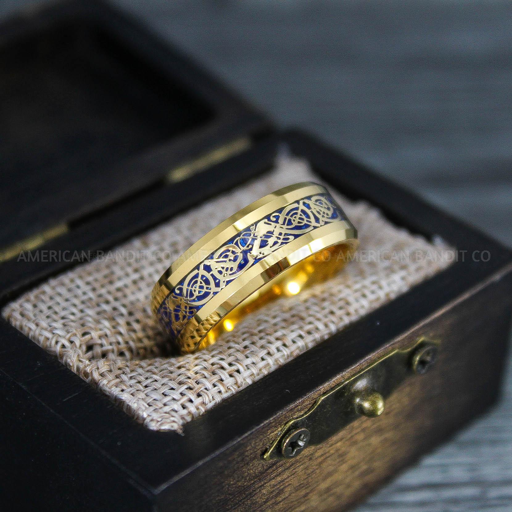 8MM YELLOW GOLD TUNGSTEN BAND WITH BLACK/BLUE CARBON FIBER AND GOLD DRAGON INLAY